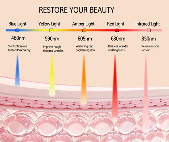 🔴 Red Light: Promotes collagen regeneration, reduces inflammation, relieves pain, promotes hair growth, and firms skin.